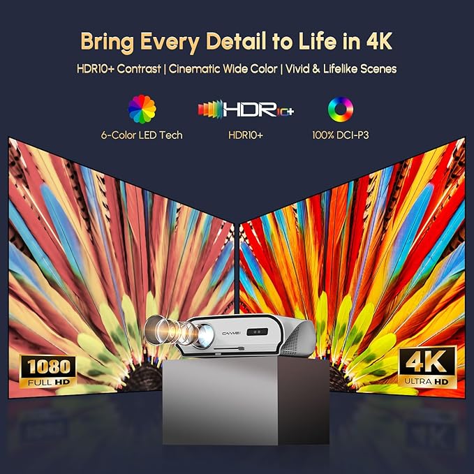 - 【True 4K Decoding with HDR10+ – A Cinema in Your Home】With native 1080P and 4K decoding , plus HDR10+ contrast enhancement, this ultra hd projector brings vivid detail and rich color to every scene. Whether it’s a family movie night in your cozy living room or watching Bollywood classics in a small café, every frame feels immersive and real.