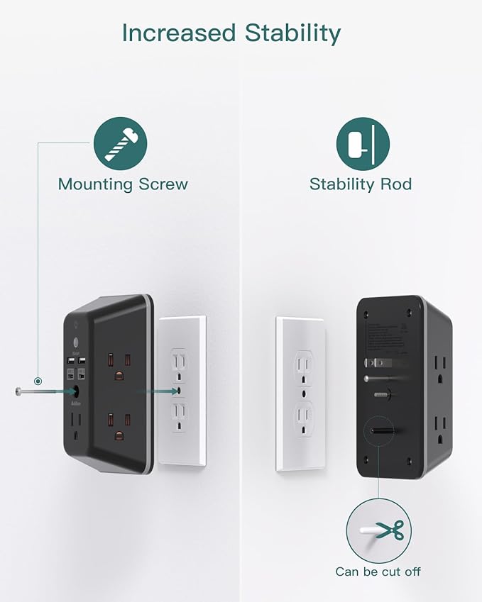- 【Double Stability & Wide Space】The screw included can be used to secure it on duplex outlet. The plastic prong at the back is for stable purposes also. For USB receptacle and GFCI outlet, the plastic prong needs to be cut off before use. 3-sided design and 1.7 inches large space between 5 sockets make it easier to use for all kinds of equipment