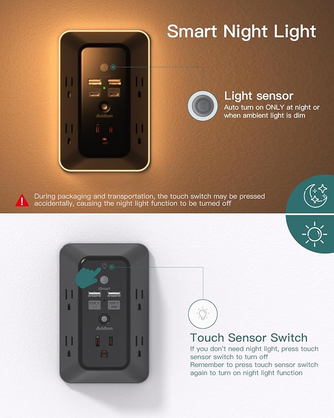 - 【9 IN 1 USB Wall Outlet】You get 4 USB charging ports (2 USB C) and 5 wide-spaced outlets; 3 side design plug extender provides large space; LED night light around the edge of the outlet extender makes life more convenient; removable screw and the plastic prong make it firmly attached to the outlets