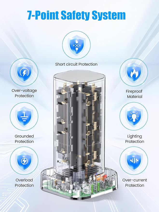 - 【Surge Protector Tower】With overload protection, short-circuit protection, and over-current protection, this device ensures your electronics stay safe. The dependable on/off switch automatically disconnects power, safeguarding your valuable devices and creating a secure charging space. Additionally, multilayer extension cords enhance safety and durability.
