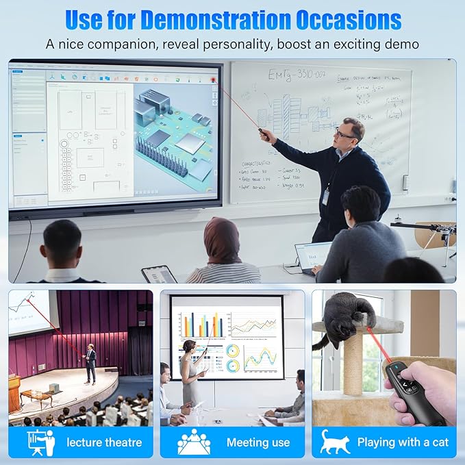 - INTUITIVE CLASSIC PRESENTATION POINTER WITH VOLUME CONTROL: This presentation remote meets the classic demands of red laser pointer, page up, page down, page left, page right, switch windows, full screen, black screen and volume control. This computer clicker for presentations is a good assistant in your teaching,coaching,speeching,meeting or conference presentations, and this laser pointer for presentation also works as a cat chase toy to entertain your pets with the bright red laser light.
