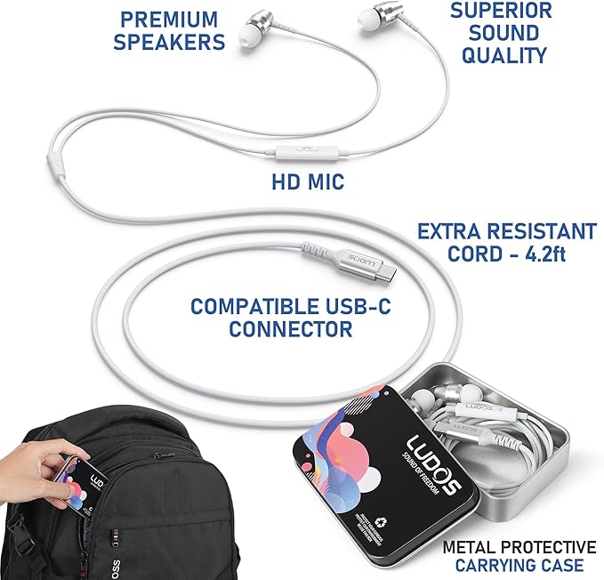 - GET THE PRIVACY YOU WANT & NOISE ISOLATION – LUDOS OMNITONE Type C earbuds not only deliver the highest quality sound, the type C headphone also helps block out distracting background noise when you’re in public settings. They deliver flawless sound without “leaking” your music or sound to people around you