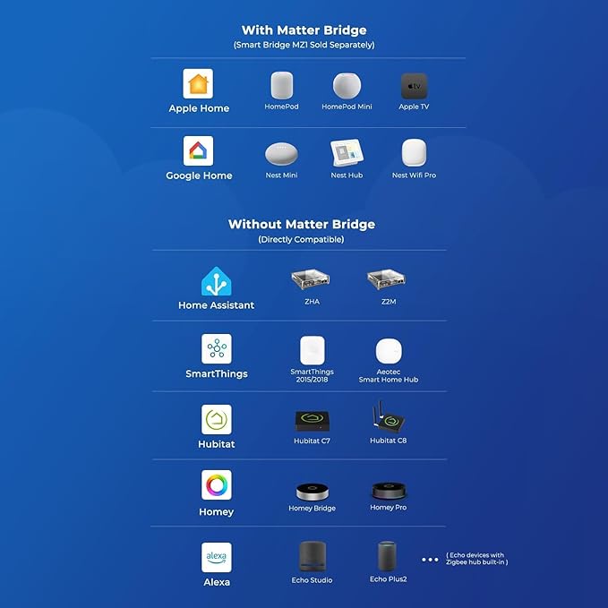 - Zigbee Standard Compatible:Works with compatible Zigbee hubs or Echo devices with Zigbee hub built-in, such as Echo (4th Gen), Echo Plus (1st Gen and 2nd Gen), Echo Studio, Eero 6, Eero Pro 6, Home Assistant, SmartThings 2015/2018, Aeotec, Homey, Hubitat, Homey Bridge, Homey Pro and Third Reality Hub, Smart Bridge MZ1, Compatibility is assured for equipment mentioned.For items not listed, their compatibility remains unconfirmed, so we advise proceeding with caution. NOTE: ZigBee Hub is required and sold separately.