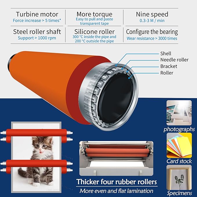 - Parameter:Film covering width:A2+/44cm(Length customization);Paper board thickness:0.1-5mm(With stepless clutch) ;Film mulching speed:0.3-3M/minute(Nine speed transmission);Power supply:110V/60hz(Total power 600W);Temperature:0-180℃(Preheating is only 3 minutes) Main engine weight:About 7kg