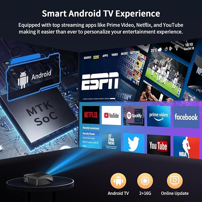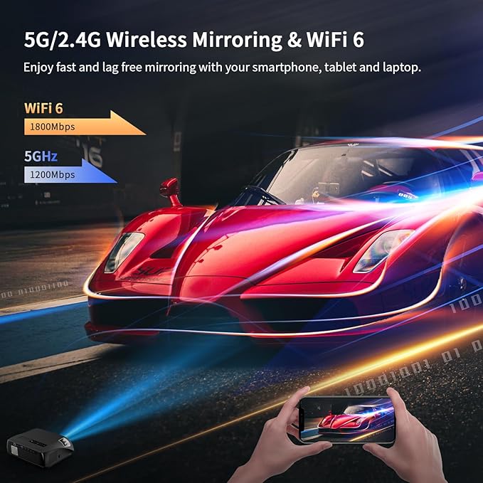 - ➤【WiFi6,NFC Cast & Two-way Bluetooth 5.2】Equipped with advanced WiFi6 with nearly 50% faster speed, flying speed makes your online viewing smooth to the end! The new NFC casting, just 1s tap with the remote that can quickly turn on the casting or remote control the smart projector, and no need to pair next time. The Bluetooth projector also can be used as a Bluetooth speaker that connect to your phone, high value for two purposes in one.
