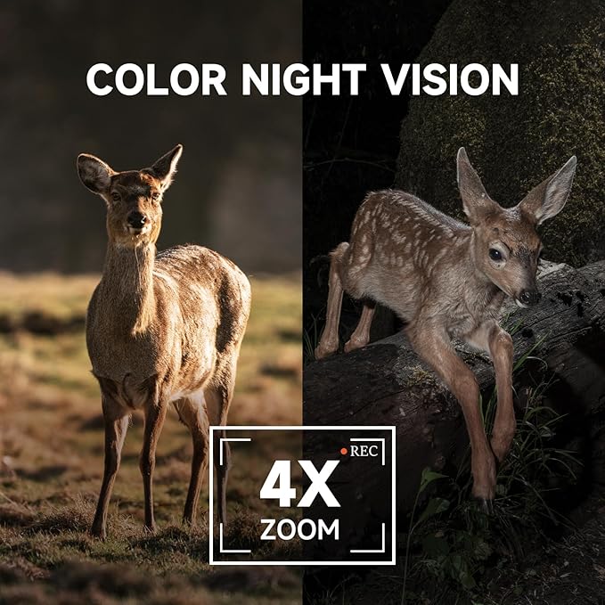 - 【2K Live Feed & Color Night Vision 】The cellular game camera captures 2K pictures with vivid colors day and night. With a built-in spotlight, 355° pan, 100° tilt, and 4x digital zoom, the outside camera provides a wider and more flexible view angle. With motion-activated spotlight and color night vision, you will have a better night vision up to 32 ft in the dark.