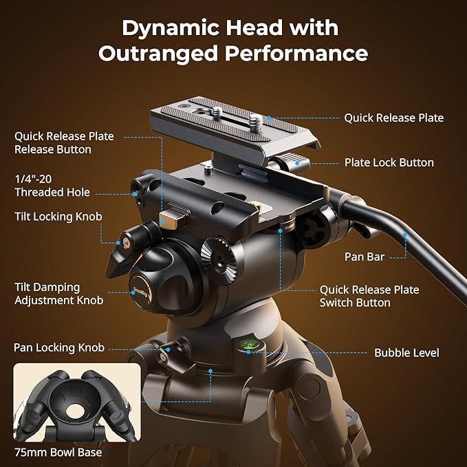 - Height Adjustment: Professional heavy duty aluminum alloy tripod built-in bubble level, high-strength aluminum alloy double-row tubes and 75mm bowl bottom, which can provide better stability for the video tripod. The adjustable height of the travel tripod is: 85-187cm/34-74in