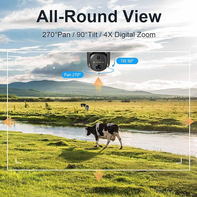 - 2K HD with 360° Control: Remotely pan 270°, tilt 90°, and zoom 4X with the UBox app, ensuring all corners of your property are covered by this solar camera outdoor wireless.