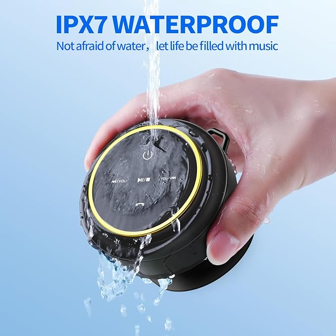 - 【 FLOATING IPX7 WATERPROOF SPEAKER】 IPX7 waterproof allow the shower speaker to be submerged in water up to 1 meter deep for up to 30 minutes. Whether in the shower, by the pool, or during outdoor activities, this bluetooth shower speaker can withstand splashes and brief submersion, and it can float on the surface of the water, making it suitable for users who love water sports or outdoor adventures.