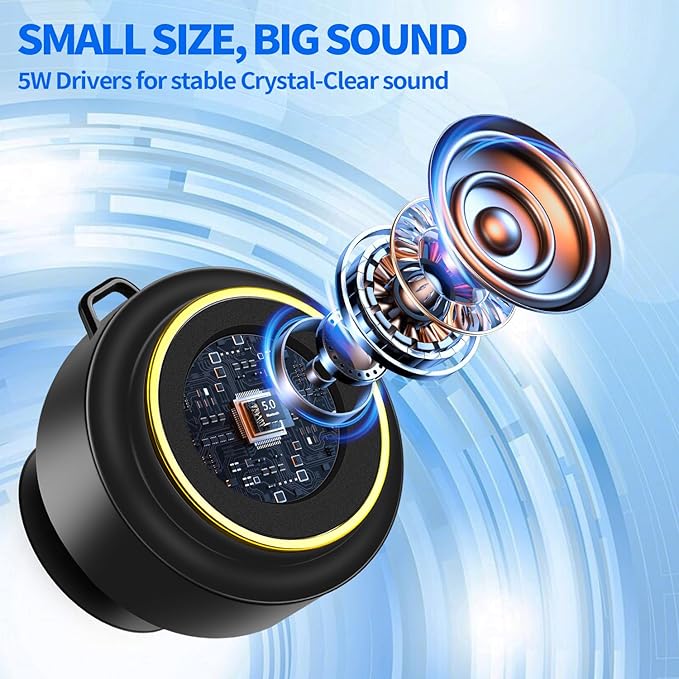 - 【CRYSTAL CLEAR SOUND】This shower speaker, with its compact design and innovative technology, delivers exceptional sound quality. It can provide immersive stereo sound effects in various environments, such as at the beach or in the bathroom. Even in the noisy shower setting, this small portable speaker outputs clear audio, showcasing excellent musicality and vibrancy. With a 12-hour battery life, enjoy lasting fun.