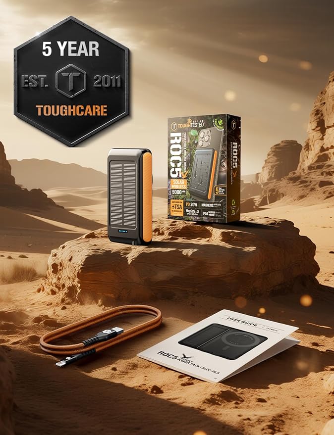 ToughTested ROC 5 Solar Power Bank 5000mAh, MagSafe Compatible Wireless Charger for iPhone 17/16/15/14/13, QC3.0 USB-C PD20W, IP54 Rugged Outdoor Battery with 5-Year Warranty for Travel, Camping