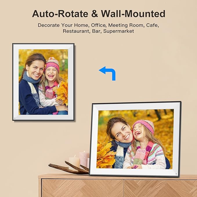 - 【Stylish Wall-Mountable Smart Picture Frame】 Show off your photos in style with this smart digital picture frame with app that wall mountable for home decor to elevate your space. The included remote or touchscreen allows easy slideshow management. Mount the wifi picture frame share on the wall or stand it on a desk - the adjustable orientation looks sleek in portrait or landscape mode. This versatile large digital photo frame blends into any decor seamlessly.