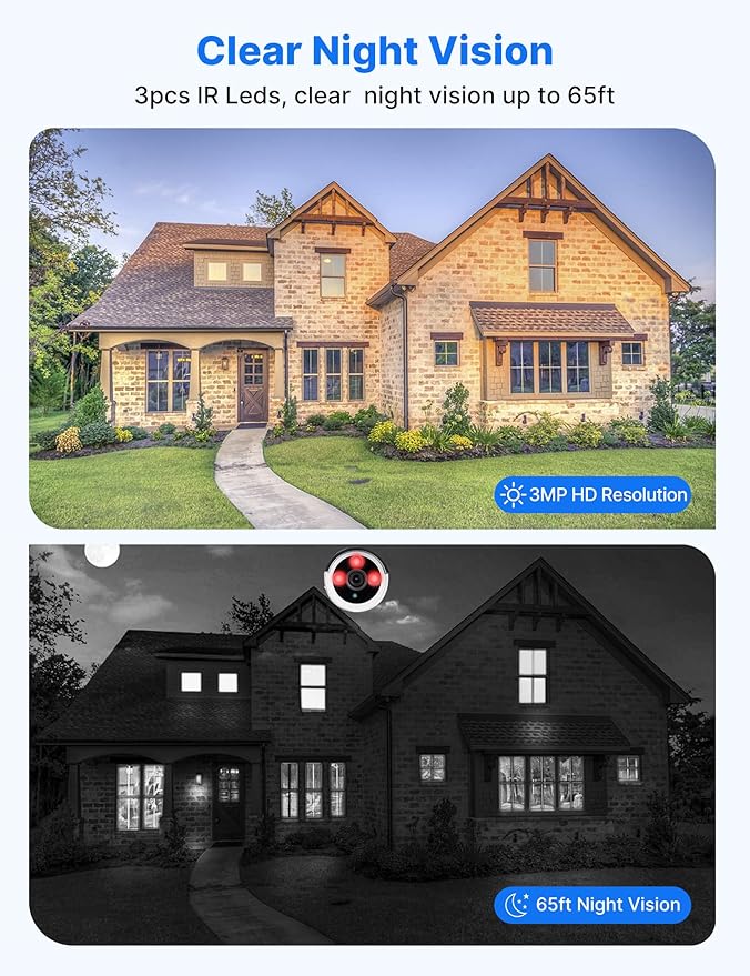 - 【Waterproof& HD Video】Records in 1944P Full HD to capture sharp and crisp images, provide crystal-clear HD live video, in order to crisp smooth footage day and night the bullet cameras build in 3 array IR cut filter with auto switch. Up to 15m Night Vision, The IP 66 weatherproof aluminum housing material to keep Indoors & Outdoors recording.