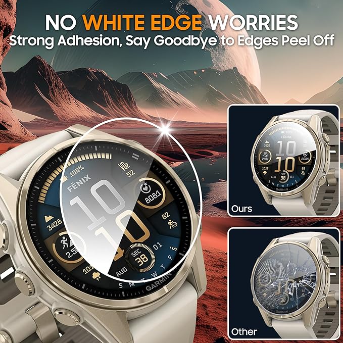 - Precise fit: This screen protector is designed to perfectly fit for Garmin Fenix 8 43mm. With its precise cut and ultra-thin design, this screen protector seamlessly blends with the fashionable aesthetics of a smartwatch, providing full coverage and ensuring bubble free installation. Oil repellent coating can repel fingerprints and oil stains