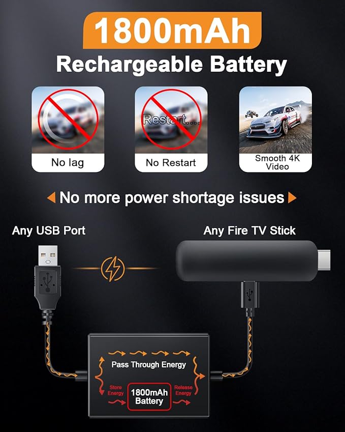 - 🔋Built-in Supplemental Battery: features a 1800mAh battery that provides backup power during insufficient supply, ensuring smooth 4K video playback and preventing the TV stick from restarts or shutdowns due to low power
