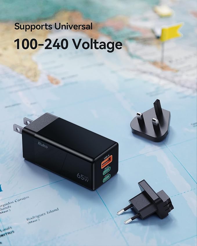 - [Perfect for On-the-Go] Ruko 65W USB C Charger Kit is your perfect travel companion, featuring a compact carry bag, a 4ft USB-C to USB-C cable, and two converters (UK/EU). With support for universal 100-240V voltage, it ensures seamless adaptability and portability for global travel.