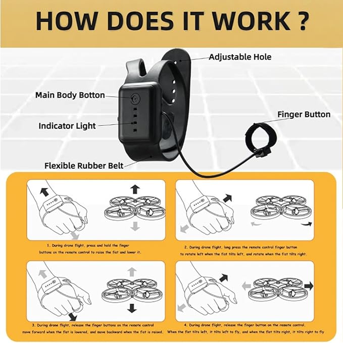 - 【Easy-to-operate Drones & Perfert Gifts for Kids】Perfect gifts for kids on all kinds of holidays. Step1: Before taking off, turn letters on the drone upwards and long press the power button to turn it on. Setp2: Set the direction of the watch parallel to the drone, and press the main body botton. Wait for the pairing of the drone and the watch. Step3: Press the finger button and the drone takes off. During flight,the direction of the kids hand gesture control drone can be controlled by changing hand gestures