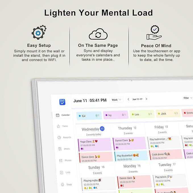 - 【All-In-One Digital Calendar】: WiFi digital calendar + planner touchscreen display + digital picture frame that will get the whole family organized and running smoothly. It’s never been easier to keep the whole family informed by assigning each member their own color and chores. Note: Update latest software in settings (About - Version - Check for updates).