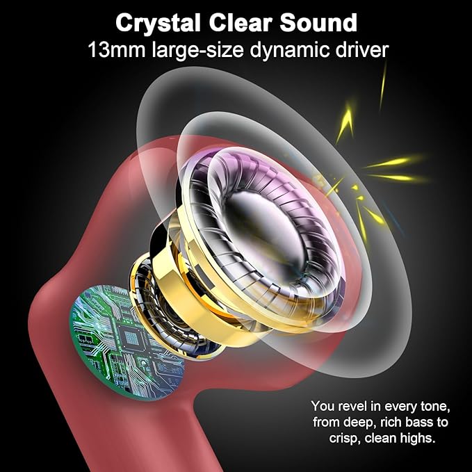 - The impressive Hi-Fi stereo sound and clear call: The wireless headphones feature 13mm drivers that boost quality sound with deep bass and mids at optimal levels that are pleasing to the ears. You will feel like an immersive concert. The built-in mic in each bluetooth earphones utilizes call noise cancellation to ensure clear and realistic sound. It will allow you to enjoy high-quality conversations anytime, anywhere.