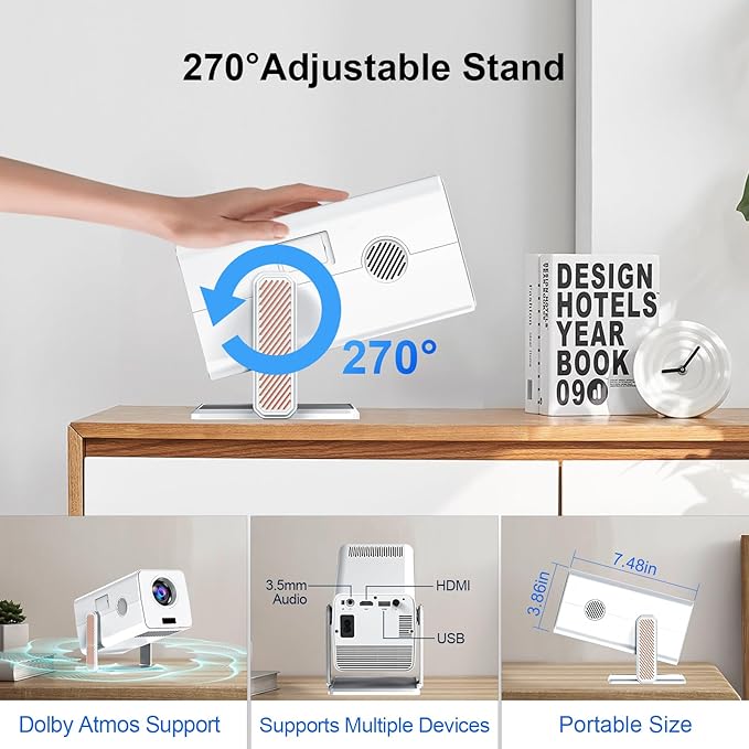 - 【AI Autofocus & 270° Rotation Projection】The short throw projector is equipped with cutting-edge AI autofocus and auto correction technology, with intelligent algorithms that capture real-time image details, completing precise autofocus and image calibration in just 2 seconds. 270 ° free rotation design, making it easy to project on both walls and ceilings. The lightweight body design makes the projector easy to carry, whether it's for family gatherings, camping with friends, or business trips.