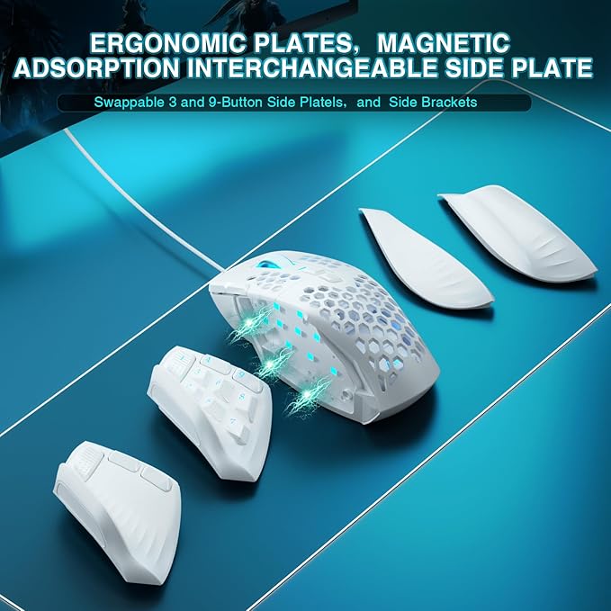 - Interchangeable Modular Side Plates: The SM809 MMO gaming mouse comes with two interchangeable side plates—one featuring 9 side buttons and the other with 3 side buttons. Utilizing a modular magnetic design, these plates allow gamers to easily switch between different configurations based on individual needs. Whether you're looking to increase the number of accessible buttons for complex in-game commands or prefer a simpler layout for daily tasks, this flexibility caters to both gaming and everyday use, providing a more tailored and versatile experience.