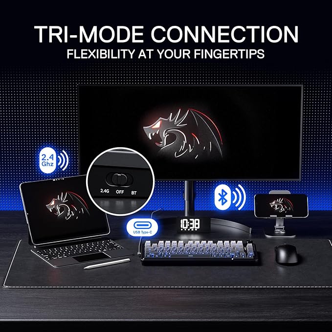 - 3-Mode Connection - Geared with Redragon advanced tri-mode connection technology, USB-C wired, BT 3.0/5.0 & 2.4Ghz wireless modes which make the user experience upgraded to another level in all fields