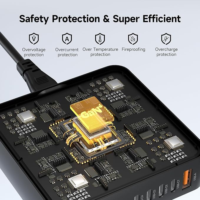 - 【Eight intelligent power】7 USB-C ports (140W+65W+30Wx5) + 1 USB-A (22.5W) with auto-sensing tech, dynamically allocate power from 5W to 140W based on device priority. Charge 3 laptops + 5 phones at max speed without overheating.
