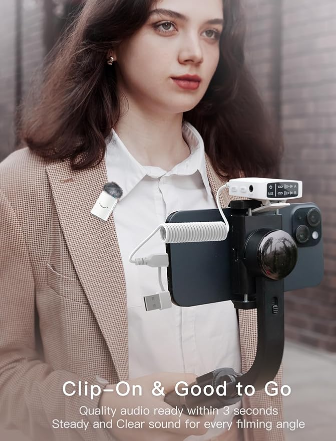 - [Versatile Compatibility, One-Stop Solution] Whether you're shooting on a DSLR, vlogging on a Type-C smartphone, or online course recording on a laptop, the wireless lapel mic for podcast is convenient to connect to Android phones, tablets, iPhones, iPads, and laptops. Clip microphone wireless is ideal choice for creators who switch between platforms or need flexibility in different recording environments.