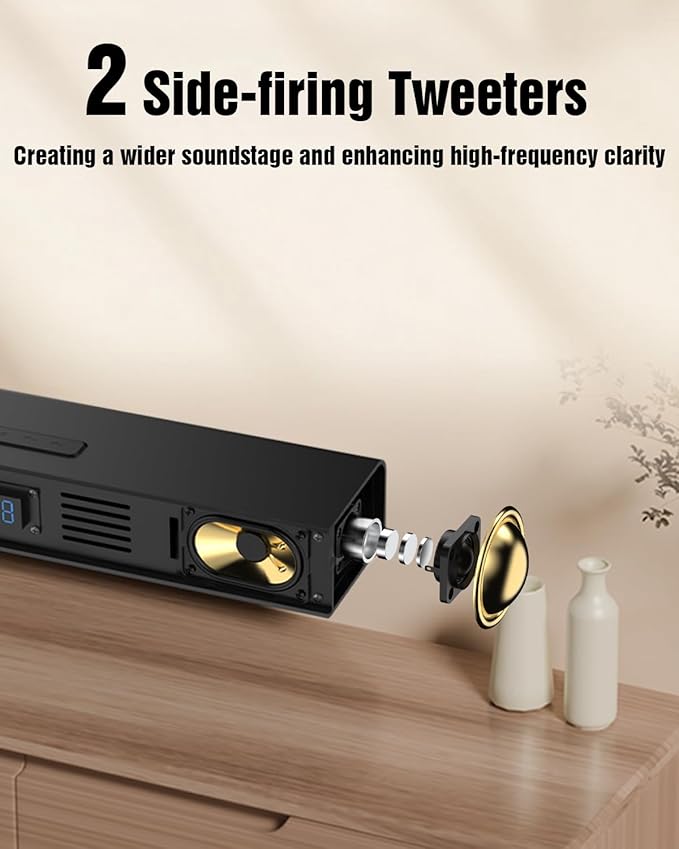 - Immersive 4.1 Dolby Atmos Experience: Experience theater-grade 3D sound with soundbar’s innovative design: 2 side-firing tweeters widen the soundstage, while flexible front surround speakers (placed above ear level) create cascading audio. Combined with Dolby Atmos, the sound bar for smart TV delivers a 360° sound field with enhanced highs and lifelike depth—perfect for movies, music, and gaming.