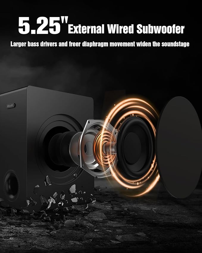 - Deep Bass That Moves You: A 5.25" external subwoofer delivers punchy, room-filling bass. Its larger driver and free-diaphragm design protect main speakers while extending low frequencies—feel explosions rumble and music rhythms pulse through your space.