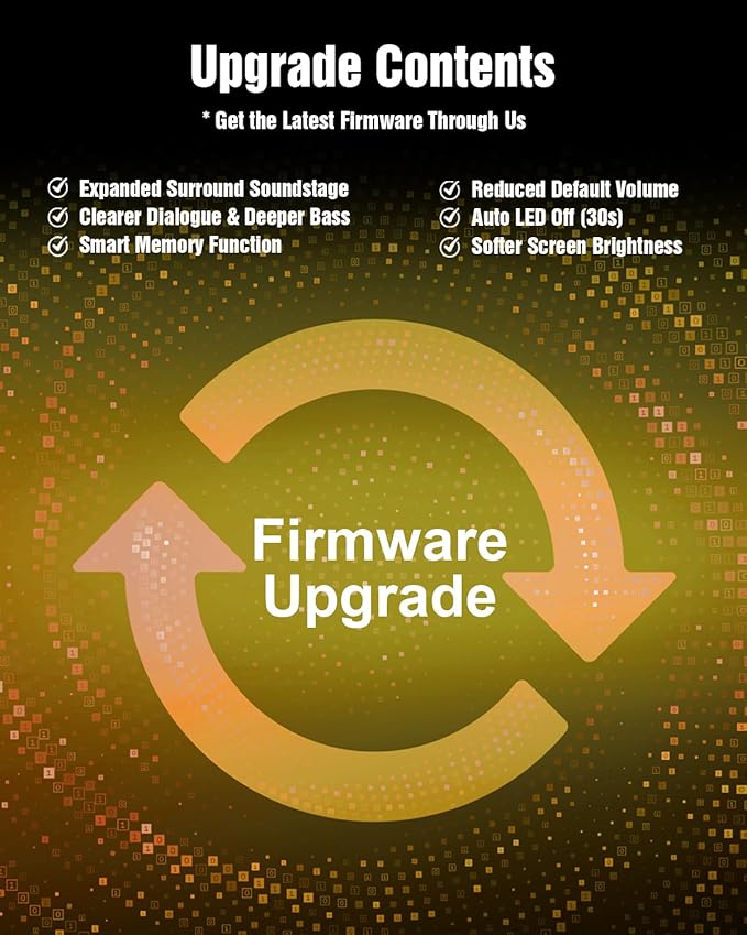 - Future-Ready Performance & Upgrades: Unlock hidden features! Access our support team for a firmware update that activates: 1)Custom Memory Function – Save your preferred sound profiles. 2)Enhanced Audio Tuning – Optimized Dolby Atmos performance & bass calibration. (Note: Units ship with latest stable firmware; this update adds new features)