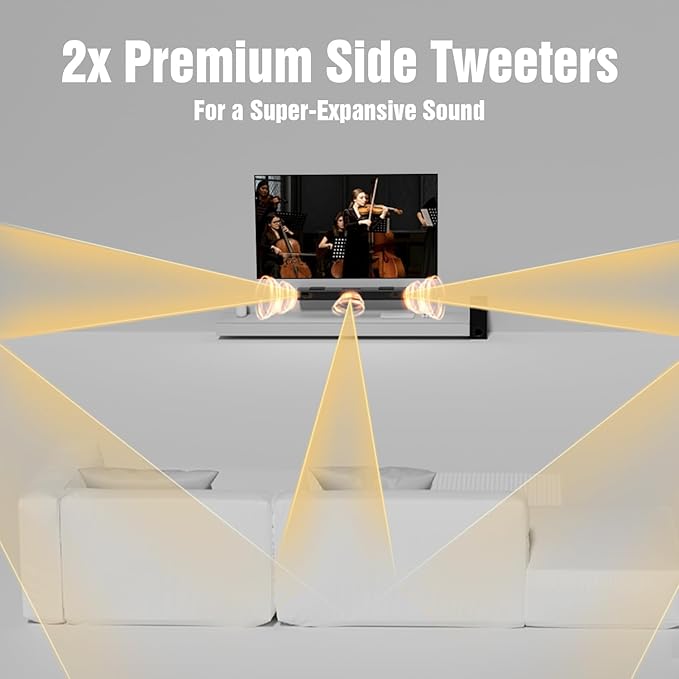 - 3 Premium Tweeters for Unmatched Clarity and Expansive Soundscape: Our soundbar features three high-frequency tweeters, including two exclusive side tweeters that significantly expand the horizontal soundstage. This enhancement optimizes treble and midrange, ensuring a more immersive, dynamic audio experience. With copper shorting rings and aluminum alloy diaphragms, the sound is precise and clear, delivering rich bass, crystal-clear dialogue, and a perfectly balanced, cinematic-quality sound