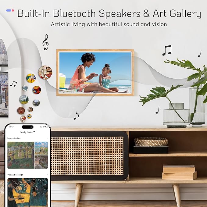 - 【Showcase Your Personal Gallery】NexFoto Wifi-enabled electronic picture frame (compatible with 2.4GHz and 5Ghz) brings your art collection and photo album to life on your wall. You can easily explore a diverse range of visual art, including masterpieces and NFT art. The minimalist modern design enhances your home decor, extra large digital photo frame can be freestanding or wall mounted, and its wall-mounted design featuring a swivel mount for easy rotation, providing a gallery-like viewing experience.