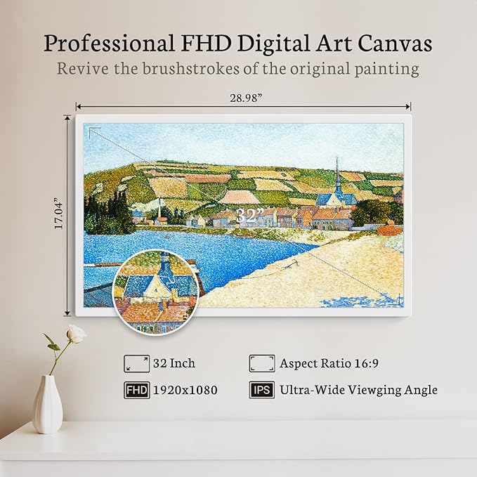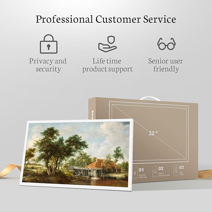 - 32 Inch FHD Touchscreen and 64GB Memory: BSIMB digital picture frame featured with 32 Inch 1920x1080 FHD IPS touchscreen and an aspect ratio of 16:9, digital frame displays stunning and clear images, which can revive the brushstrokes of the original painting. The digital picture frames built-in 64GB internal storage (holds 160,000+ pictures) with support for Micro SD Card (TF Card) and USB drive. This photo frame electronic also with a remote control making it perfect for older or less tech-savvy people to operate. NOTE:The battery type for this remote is AAA+, not included in the package.