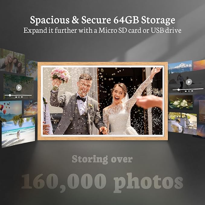 - All-In-One Digital Picture Frame for Gifting: BSIMB large digital picture frame designed with multi-functionalities. 1. Explore customisable settings including photo captions, weather and clock, slideshow mode, sleep mode and more. 2. Digital picture frame large perfect gift for families and friends on big days, such as wedding, birthday, Christmas, Thanksgiving, Mother’s Day and so on