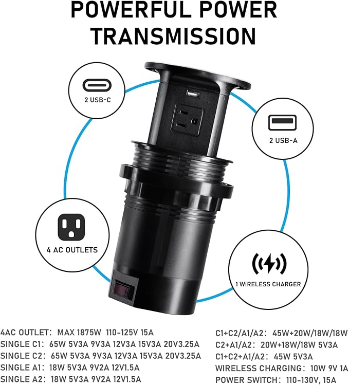 - Safe use of electricity: Rated voltage 110-125V, rated current 15A. USB output 20V 3.25A. Equipped with a power switch with overload protection function, one-click solution to hidden dangers and waste