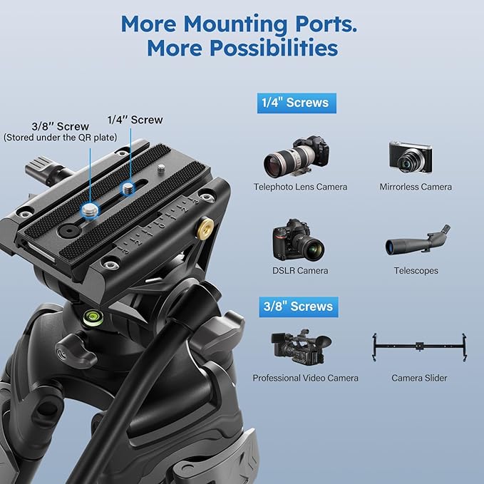 - 【Quick Release Mechanism for Easy Setup】Designed for efficiency, the tripod features a quick-release plate with 1/4" and 3/8" screws for effortless camera mounting and removal. The snap-on design ensures fast assembly, saving time during fast-paced shoots.