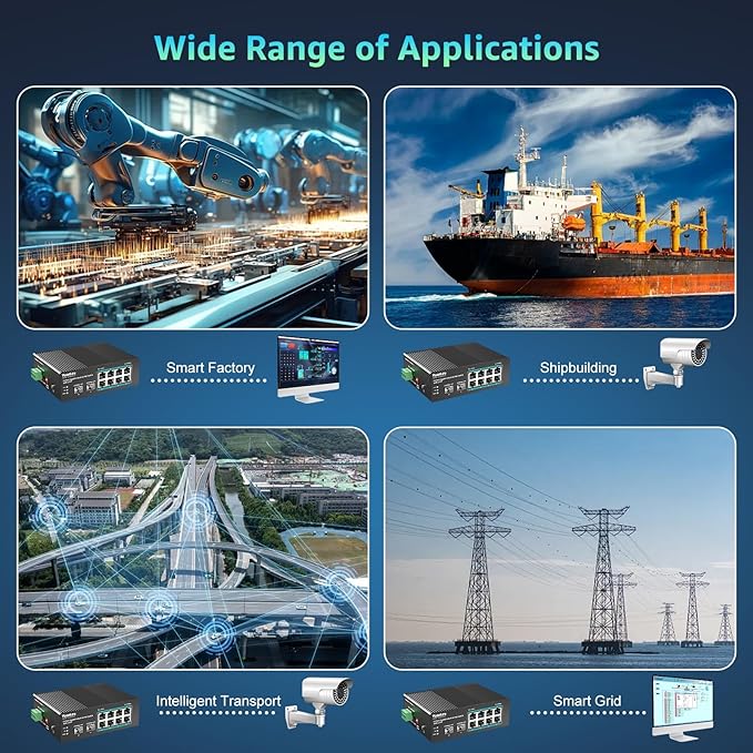 - 【Highly Reliable Industrial Grade Switches】IP40 protection grade, it can work in a wide temperature range from -40°C to 80°C (-40°F to 176°F). 6KV lightning protection and overload protection. Suitable for Industrial scenes such as metallurgy and green energy construction form a cost-effective, stable and reliable communication network.