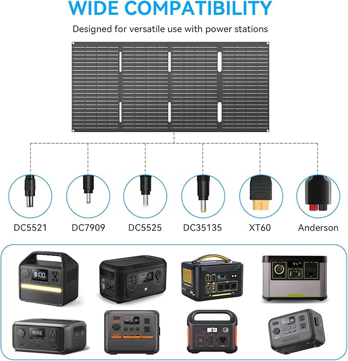 - Wide Compatibility: Equipped with QC3.0 USB-A (Max 24W), PD3.0 USB-C (Max 30W), and 18V DC port, this solar panel includes DC5521 to XT-60 and Anderson cables. It can directly charge small solar generators, battery packs, iPads, smartphones (Android and Apple), and other everyday devices. Be sure to check each port's voltage and current limits for safe and efficient charging