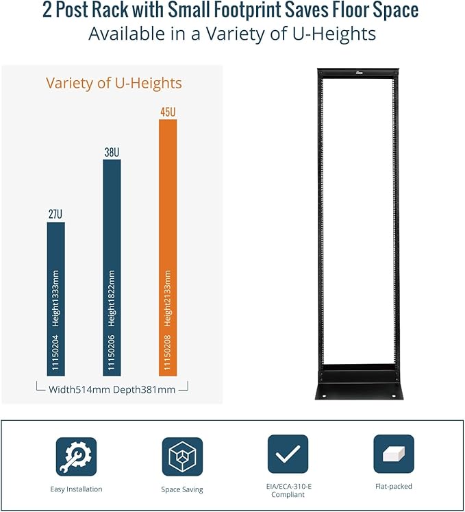 - Space-Saving Open Frame Design: Compact 2-post rack maximizes airflow and fits easily in server rooms, network closets, or home labs; pre-drilled holes at the base allow for secure floor mounting