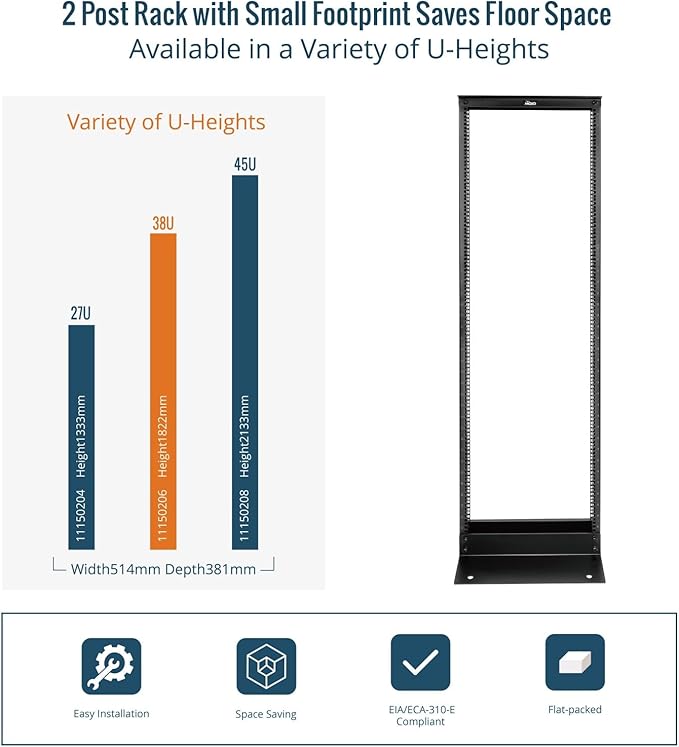 - Space-Saving Open Frame Design: Compact 2-post rack maximizes airflow and fits easily in server rooms, network closets, or home labs; pre-drilled holes at the base allow for secure floor mounting