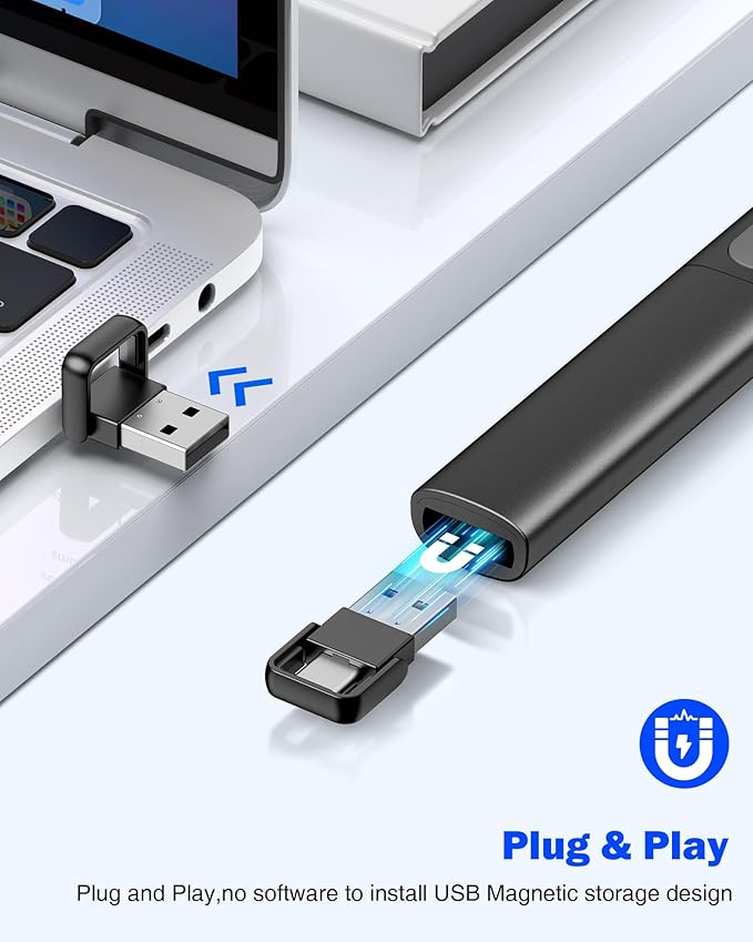 - 【USB Type C DUAL-HEAD RECEIVER DESIGN】:Plug and Play,Widely Compatibility.The UBS Type C dual-head receiver design of the wireless presenter remote can meet most of your usage needs. Don't worry even if you encounter a situation where you need to temporarily change the device, this receiver can be transferred to a device with a different interface. The tail of the presenter clicker also comes with a magnetic storage design, which can better store the receiver without worrying about losing it