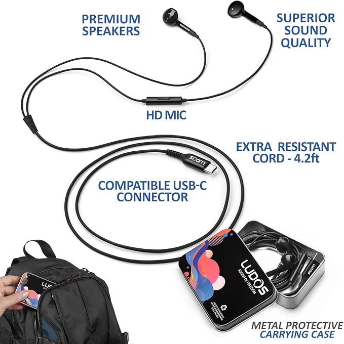 LUDOS FEROX USB C Headphones for iPhone 17 16 15 Pro Max Plus Air iPad Pro, 5 Years Warranty, USB-C Earbuds for Samsung Galaxy S24 S23 Ultra S22 S21 FE S20 Z Flip 3 Fold 4 A53, USB Type C Earphones