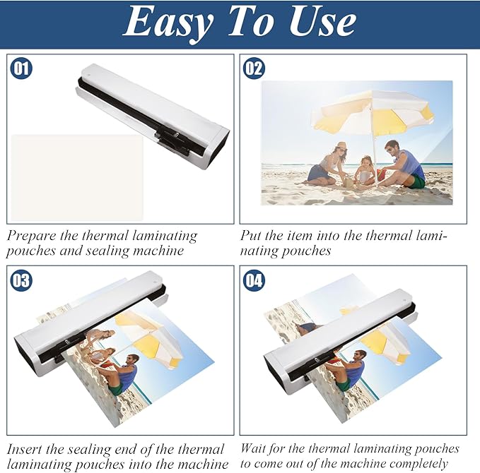 - Easy To Use: First, turn on the laminator and select the appropriate thickness gear for the laminating sheets. Secondly, open the lamination sheets, place the item into the laminate sheets, and reserve a certain edge sealing bit. Finally, the sealing side of the first into the laminating machine inlet waits for it to come out completely from the other end of the machine. Warm reminder: Please do not pull with your hands during the process of machine sealing