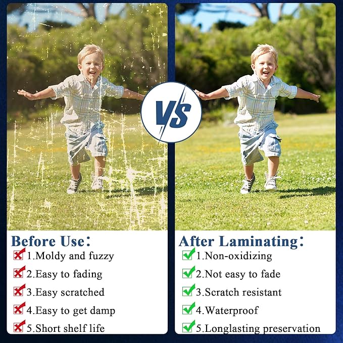 - Waterproof and Stain Proof: Laminator sheets is made of high quality PET film + EVA adhesive layer, strong adhesion, flat and not easy to generate air bubbles, and can be stored for a long time. laminating paper is practical and tear resistant, which is highly waterproof and stain proof. Extreme protection for your file photos