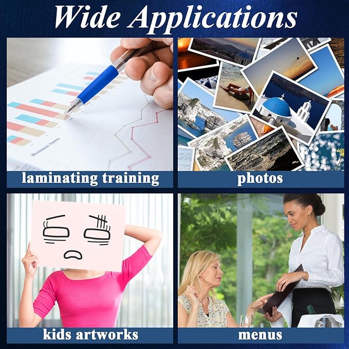 - Wide Applications: Transparent laminator sheets can be used in offices, homes, schools, restaurants, etc. You can use it to plasticize children's artwork, timetables, office documents, recipes menus, business cards, photographs, lists of affairs, promotional leaflets, collectibles, and more