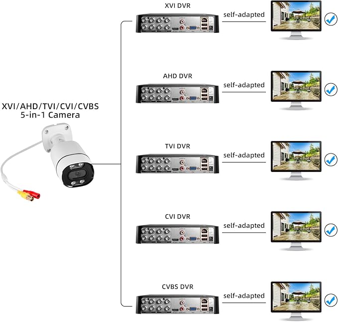 - 【5MP HD 5-IN-1 Security Camera】This is 5-in-1 TVI/CVI/XVI/AHD/CVBS bullet camera. It is compatible with 960H,720P,1080P,3MP,5MP,HD-TVI, AHD, CVI, and CVBS/960H analog DVRs.The default video mode is 960H mode, compatible with all analog DVRs. The 1080P video mode needs to be switched according to your 1080P DVR type.