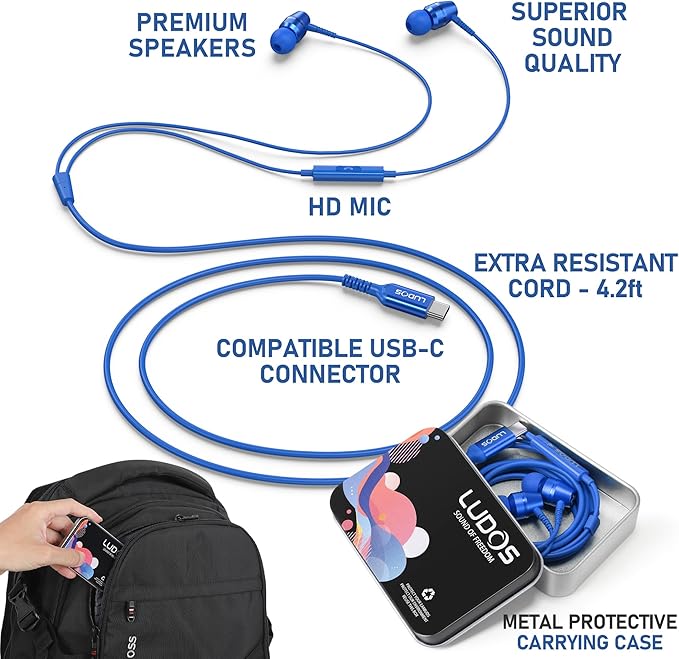 LUDOS OMNITONE USB C Headphones for iPhone 16 15 Pro Max Plus iPad Pro, 5 Years Warranty, USB-C Earbuds for Samsung Galaxy S24 S23 Ultra S22 S21 S20 A55 A54 A53, USB Type C Earphones - Blue
