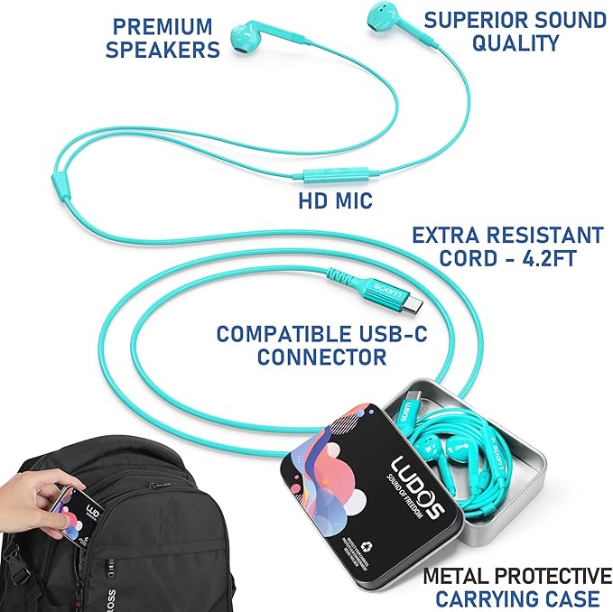 LUDOS FEROX USB C Headphones for iPhone 16 15 Pro Max Plus iPad Pro, 5 Years Warranty, USB-C Earbuds for Samsung Galaxy S24 S23 Ultra S22 S21 S20 A54 A53, USB Type C Earphones - Turquoise