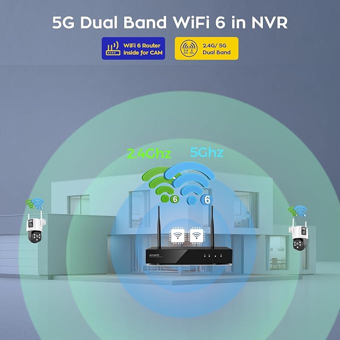 - 【Long Range WiFi 6 for Easy Installation】Evolved to latest WiFi 6 technology, on open ground the XMARTO WiFi cameras can be installed up to 1300ft (400m) away from the NVR. In actual houses with walls & interferences, you can still mount the cameras a few hundred feet away. This makes it possible to use the cameras wirelessly